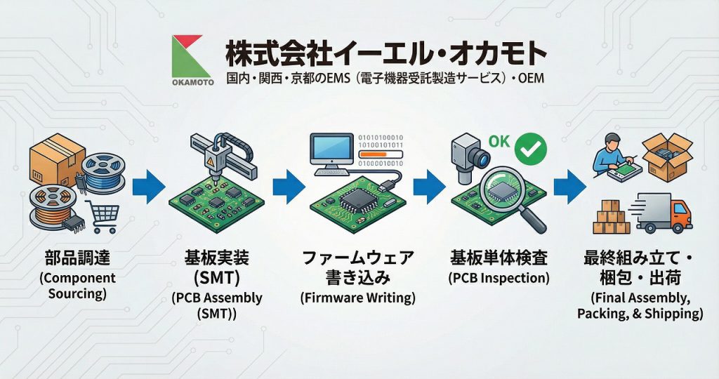 イーエル・オカモトでは、以下の工程を一貫してご提供することで、お客様の手間を丸ごと解決します。電子部品を含めた部品の調達代行による購買工数の削減、基板実装後のファームウェアの書き込みはもちろん、プリント基板の単体検査まで一貫で行うことで製造工数も大幅に削減します。